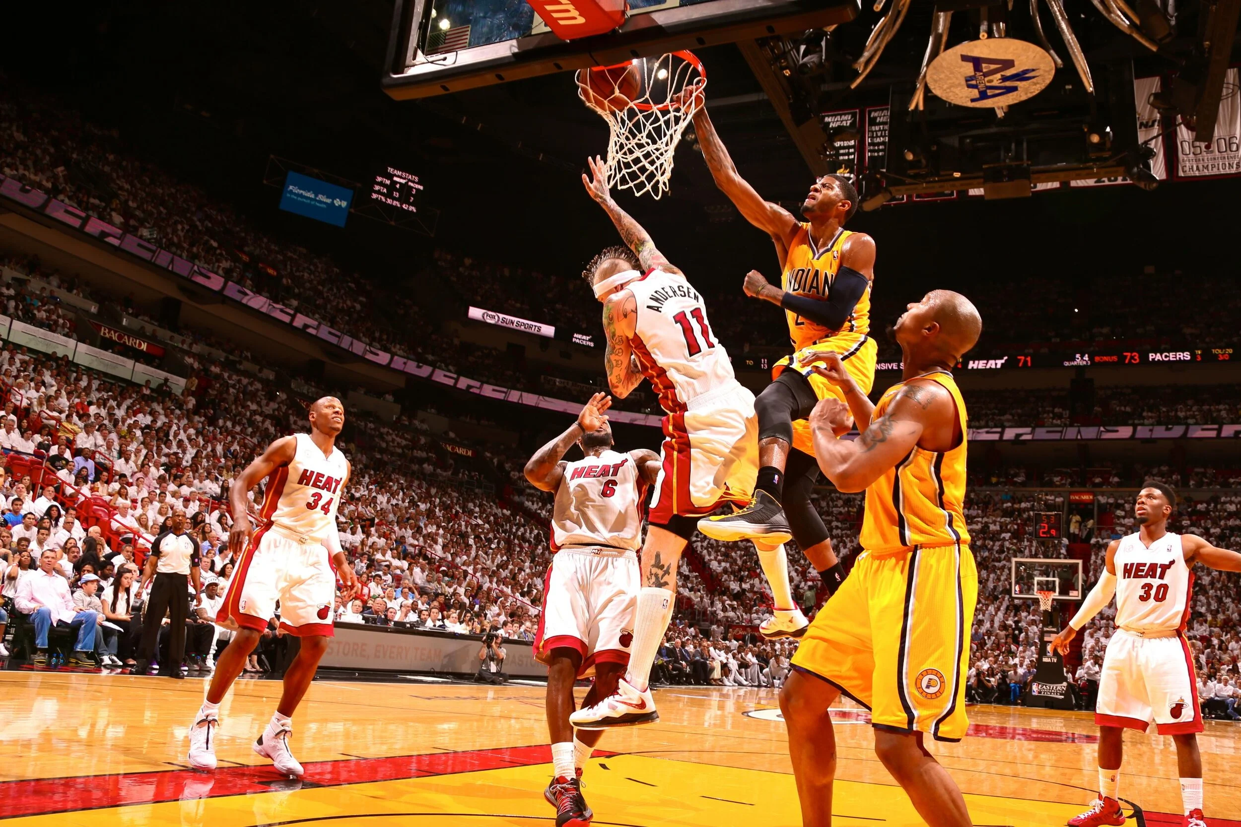Paul George slams on Chris “Birdman” Andersen and evens the series at 1-1.